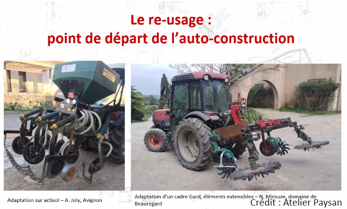 Le projet Vi’REG est porté par l’Atelier Paysan basé à Renage en Isère et financé par le CASDAR. Il met des groupes de viticulteurs et viticultrices au coeur d’une réflexion sur l’auto construction et le réemploi des outils pour gérer les couverts végétaux.